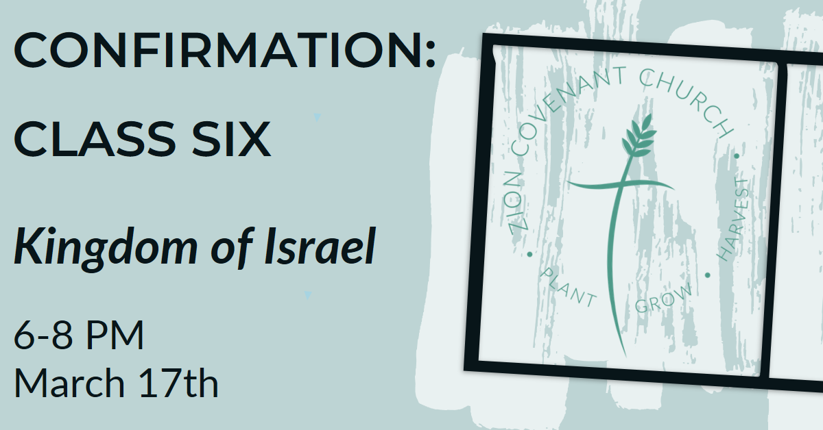 Our next confirmation class meets Sunday, March 17 at 6 PM. This month we are covering the history of the Kingdom of Israel, starting with the story of Joshua as Israel enters the promised land, the stories of the Judges, then the history of the kingdom of Israel from the time of Samuel and Saul up to the Exile.
