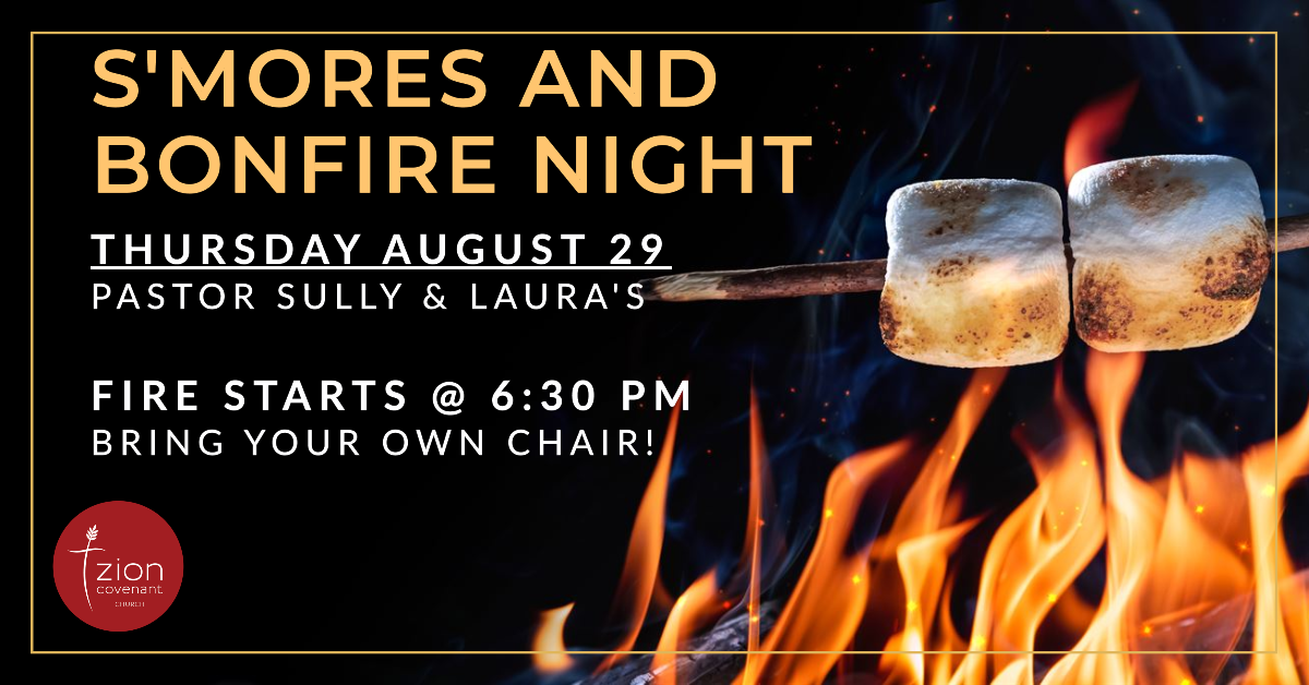 Pastor Sully and Laura are hosting this month’s s’mores night on Thursday, August 29! Join them at their house for a chat around the fire. All are welcome to join—if you’re able, please bring a lawn chair. If you need directions, send Pastor Sully an email at pastor@zioncovenant.org.