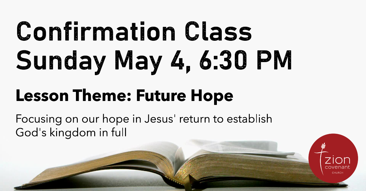 This month’s confirmation class is our final one! This class will focus on our future hope in Jesus’ return, when he will come to establish God’s kingdom in full at the end of the age.